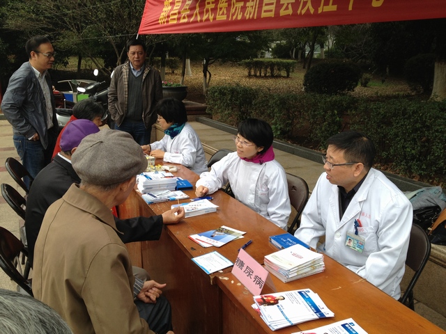 本网讯(陈莹莹/文)2014年11月14日是联合国第八个糖尿病日,主题是“健康饮食与糖尿病”。为了迎接联合国糖尿病日,为了让众多糖尿病患者正确认识糖尿病,让广大群众了解健康饮食,11月9日上午,我院内分泌科组织医护人员在江滨公园止水碑广场举行糖尿病治疗、护理、预防及科普知识等方面义诊活动。