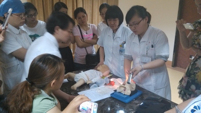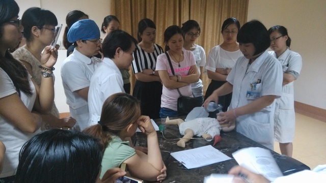 本网讯(王玲玲/文)2014年5月29日晚上,在VIP诊疗区培训室人头攒动,我院第一期新生儿复苏培训在这里举行,本次培训由VIP诊疗区组织,我院儿童健康中心主任王玲玲、新生儿科主任吕亚芳和新生儿科骨干医生梁园主讲,VIP诊疗区医护人员共20余人参加。