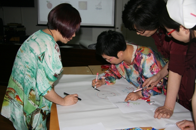 课上,王主任首先将学员们分成三个组别,以小组形式开始学习,随后王主任从她本人制作的一张自我介绍图开始,深入介绍了思维导图的五大要领、三种形式,以及放射性思考和垂直思考的方法和作用等,并带领学员进行了个人思维导图练习以及团队合作练习。王主任的课程理论结合实践,通俗易懂,讲课过程中不断与学员进行互动,课堂气氛非常活跃。虽然学员们画工略粗糙但是丝毫不影响学习积极性,大家纷纷拿着自己的第一张思维导图向身边的学员们自我介绍,将此次培训课推向了高潮。