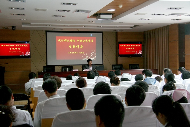 本网讯(张锴/文/图)4月3日下午,我院邀请县委党校校长赵明尧在行政楼5楼中型会议室举行“践行群众路线 争做优秀党员”专题讲座,全体中层以上干部、党支部书记和部分积极分子共130余人参加了本次活动。
