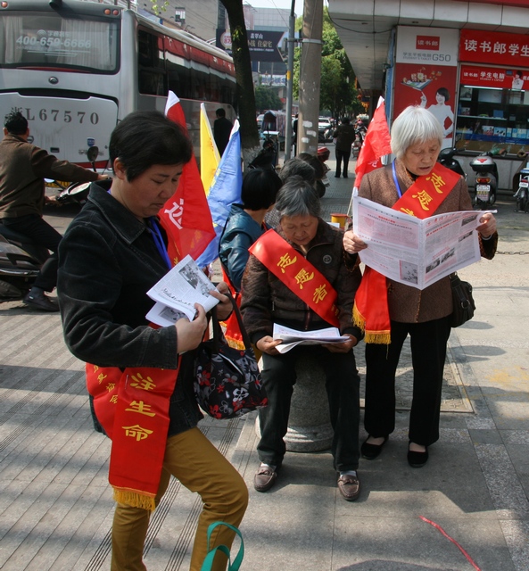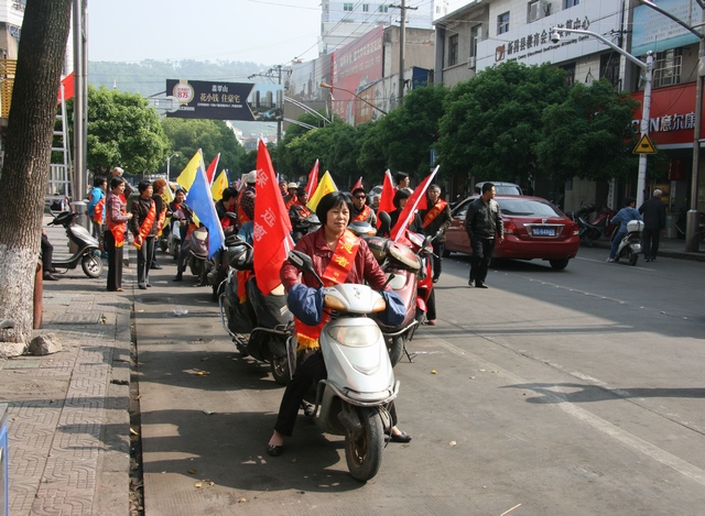 上午八时三十分,活动正式开始。来自肿瘤康复协会的叔叔阿姨们自发组成的宣传队,成为了城市的一道靓丽风景。带上宣传标语,骑上电瓶车绕新昌城中一周,为宣传周造势。