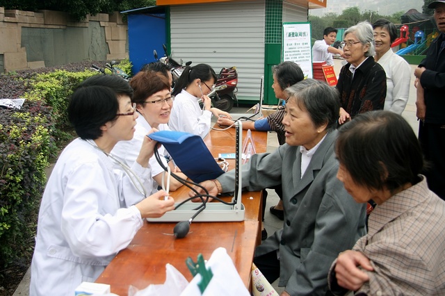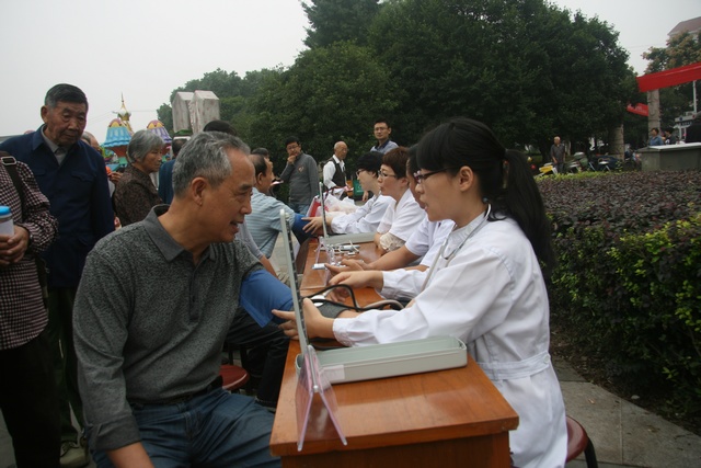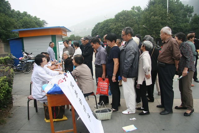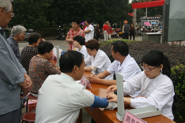 在江滨公园,医务人员一边为老年人量血压,一边为他们讲解秋冬季传染病防治知识,针对老年人常见疾病的早期症状、日常生活中如何预防等问题进行详细地讲解,受到群众好评。
