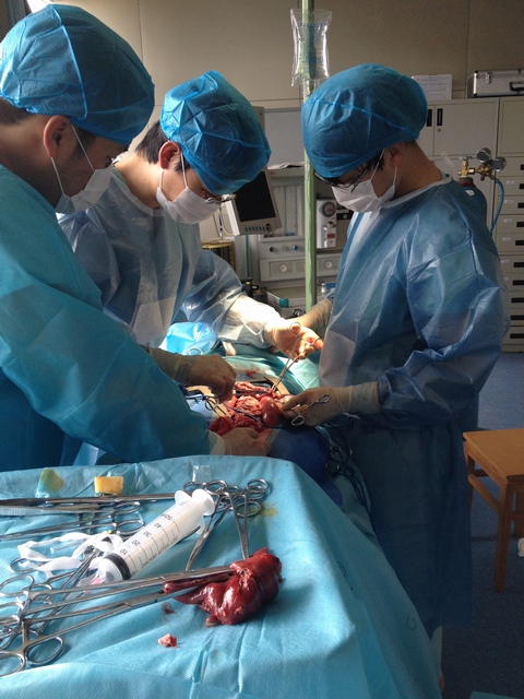 本网讯(潘颖颖/文/摄)2月24日,根据年初安排,科教科组织了春节后首次动物手术, 17名临床医师和实习同学参加了此次操作练习。上午九时左右,在相关人员的帮助下,对提供的手术对象实验猪进行了清洗、麻醉、气管切开插管等准备工作。接着,在泌尿外科徐法仁主任的指导下,多名住院医师上手术台在实验猪身上进行了腹腔镜下的操作练习,包括肠穿孔修补、左肾切除术等。下午则由班翼飞老师带教,对动物猪进行进腹手术,手术包括胃穿孔的修补、肠切除吻合术、下腔静脉破裂修补等。到了晚上,为充分利用动物资源,陈铿医师带领实习同学进行解剖,同时指导他们各种缝合的练习。