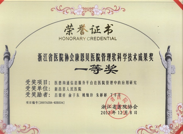 本网讯(吕文斌/文)据悉,浙江省医院协会于12月14日至15日在杭州召开2012年学术年会,会上表彰了浙江省医院协会康恩贝医院管理软科学技术成果奖。由我院吕银祥院长承担完成的“医患沟通信息服务平台在医院管理中的应用研究”项目喜获一等奖。