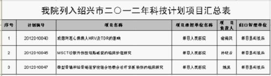 几年以来,我院非常重视科研管理工作,积极鼓励开展各项科研工作,从政策、资金、人才等各个方面予以倾斜,取得了较好的成绩。今年,自通知申报绍兴市科技计划以来,有多个项目提出申请,为保证项目质量,避免一唯地追求数量,经科教科汇兑初筛、医院伦理委员会和学术委员会分别讨论审定,同意其中的四个项目上报绍兴市科技局,最后三个项目获得批准立项,列入了2012年科技计划。图为项目汇总。