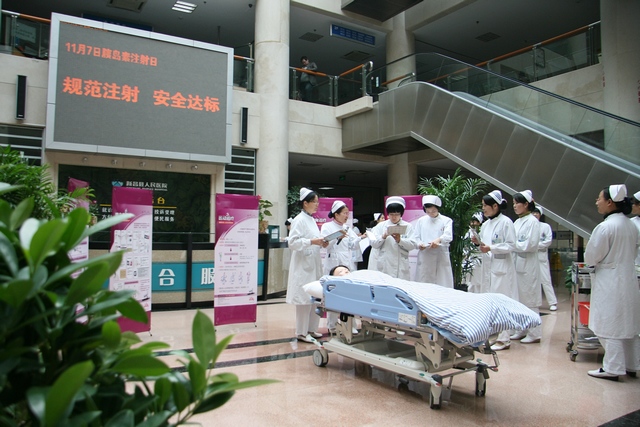 本报讯 (潘月敏/文 张锴/摄)11月7日是糖尿病规范注射日。为弘扬我院糖尿病专科护理文化,把规范的注射技术方法更快更广地推荐给患者,昨日下午,我院在门诊大厅举行了一场别开生面的“胰岛素规范注射技术”竞赛。
