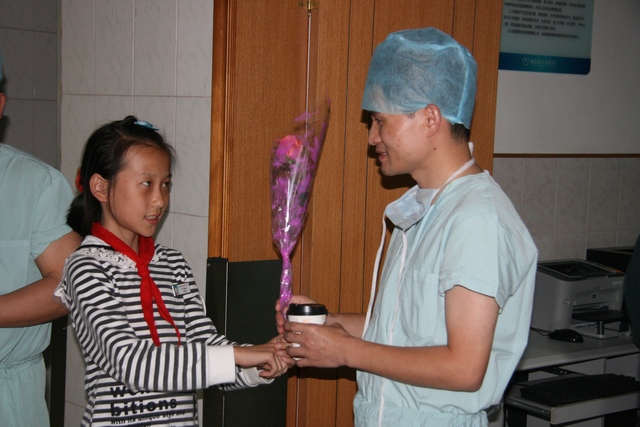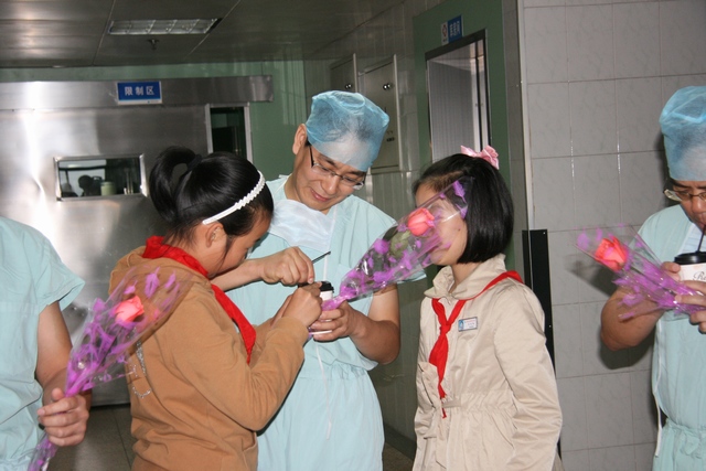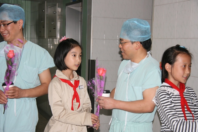 本网讯 (杨苗均/文 张锴/摄)“叔叔们,辛苦了!”“我们长大了也要和您们一样当一名伟大的天使。”10月19日我院第五个医生节,手术室门前人头攒动,来自城西小学的小记者们给手术室出来的医生们送上鲜花、递上热咖啡,并送上自己的祝福与敬意。