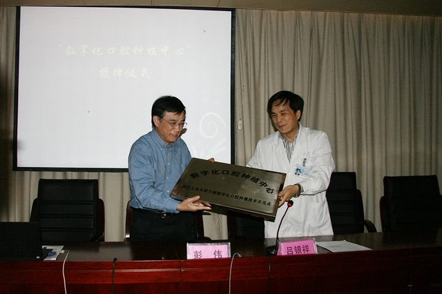 本网讯 (张锴/文/摄)10月18日下午,我院“数字化口腔种植中心”揭牌仪式在门诊11楼报告大厅举行。院长吕银祥和浙江工业大学教授彭伟出席仪式并为中心揭牌。