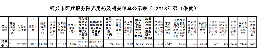 新昌县人民医院2016年第一季度医疗服务阳光用药及相关信息公示