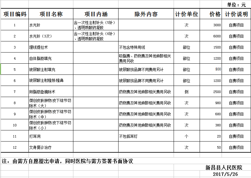 新昌县人民医院自主制定价格公示表(整形科)