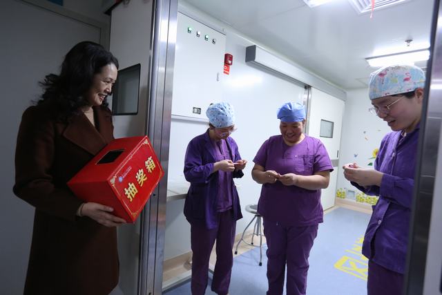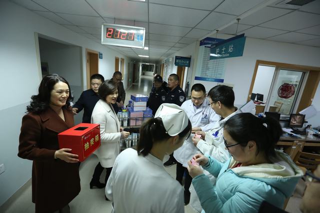 2月4日除夕夜,我院党委书记、院长吕银祥及医院领导班子成员、部分职能科室负责人带着满满的礼物和奖品看望慰问七星院区、城东院区和总院所有科室的值班人员,为他们送上节日的祝福。