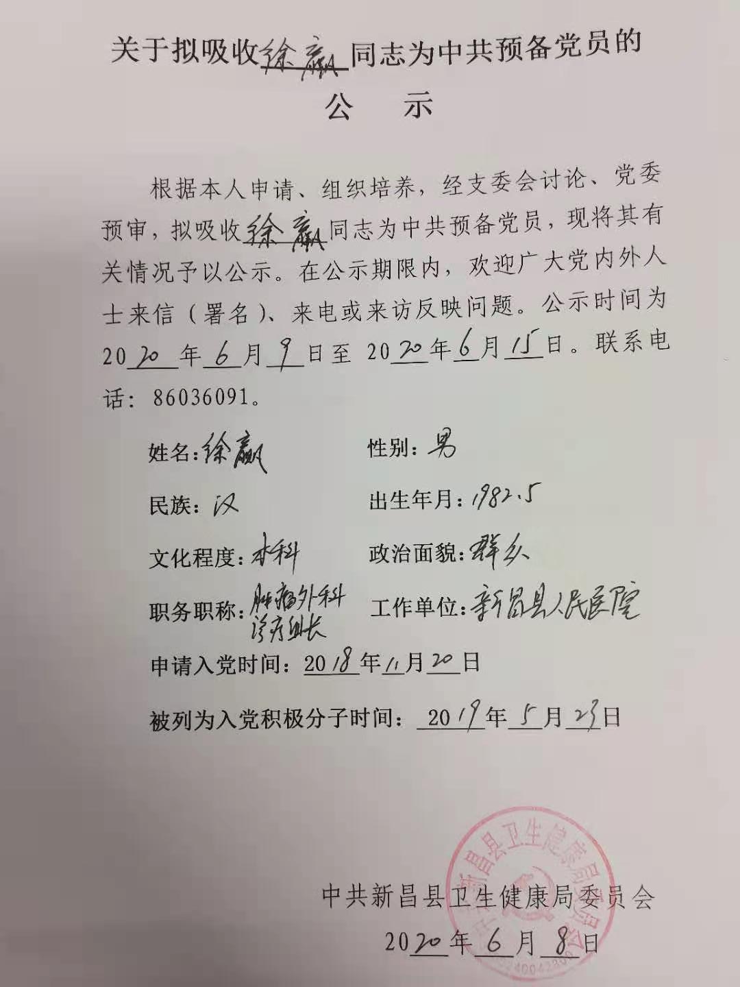 关于拟吸收徐赢同志为中共预备党员的公示