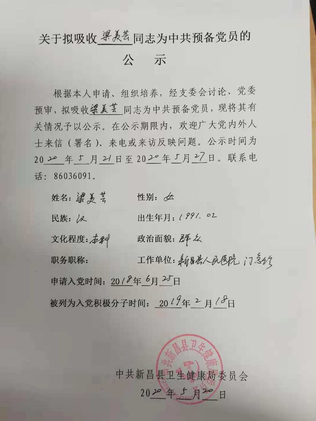关于拟吸收梁美芸同志为中共预备党员的公示