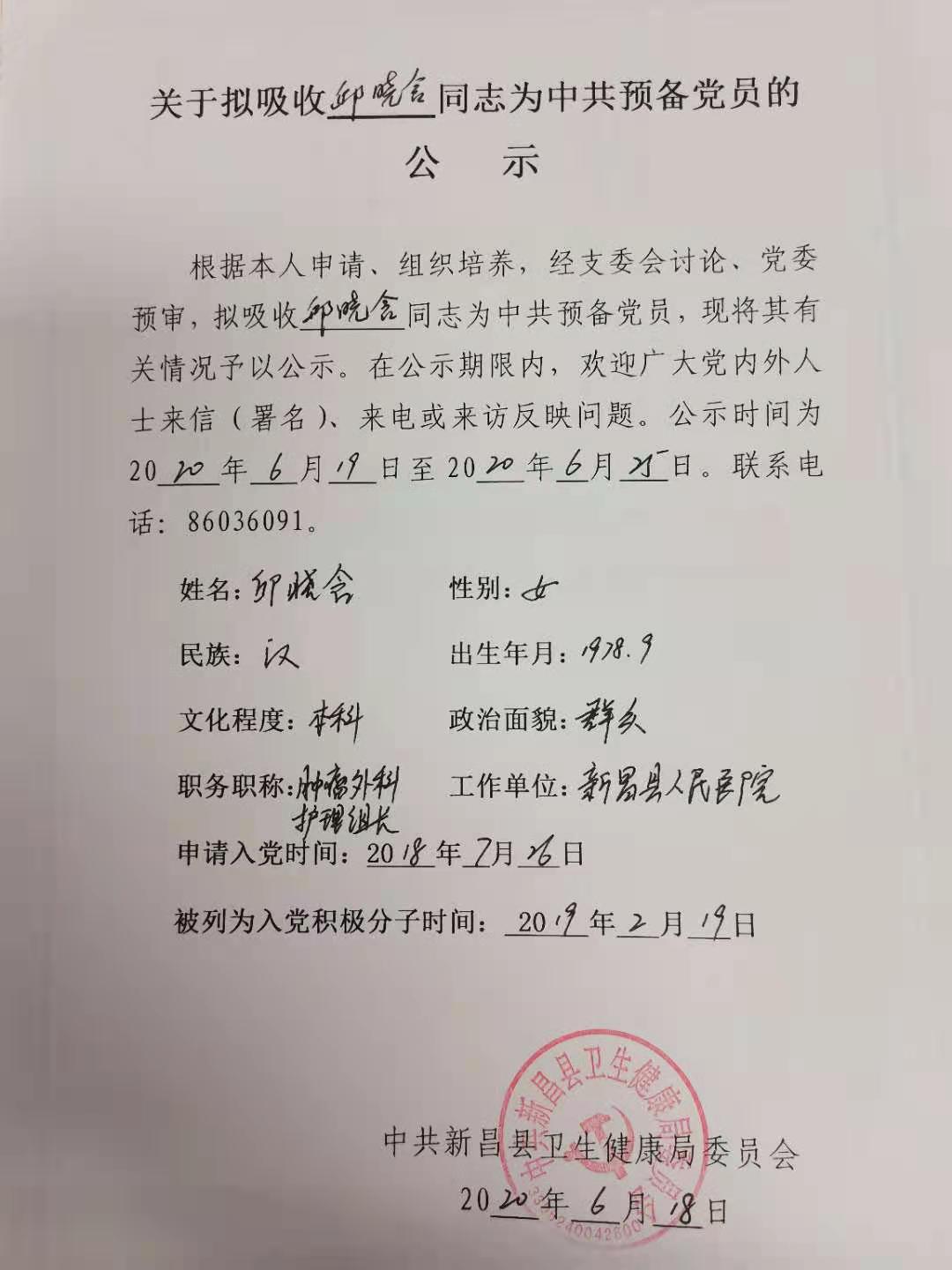 关于拟吸收邱晓含同志为中共预备党员的公示