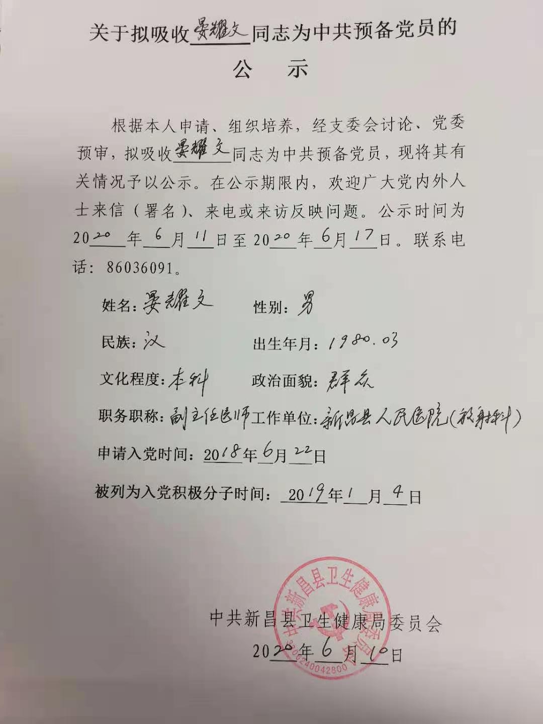 关于拟吸收晏耀文同志为中共预备党员的公示