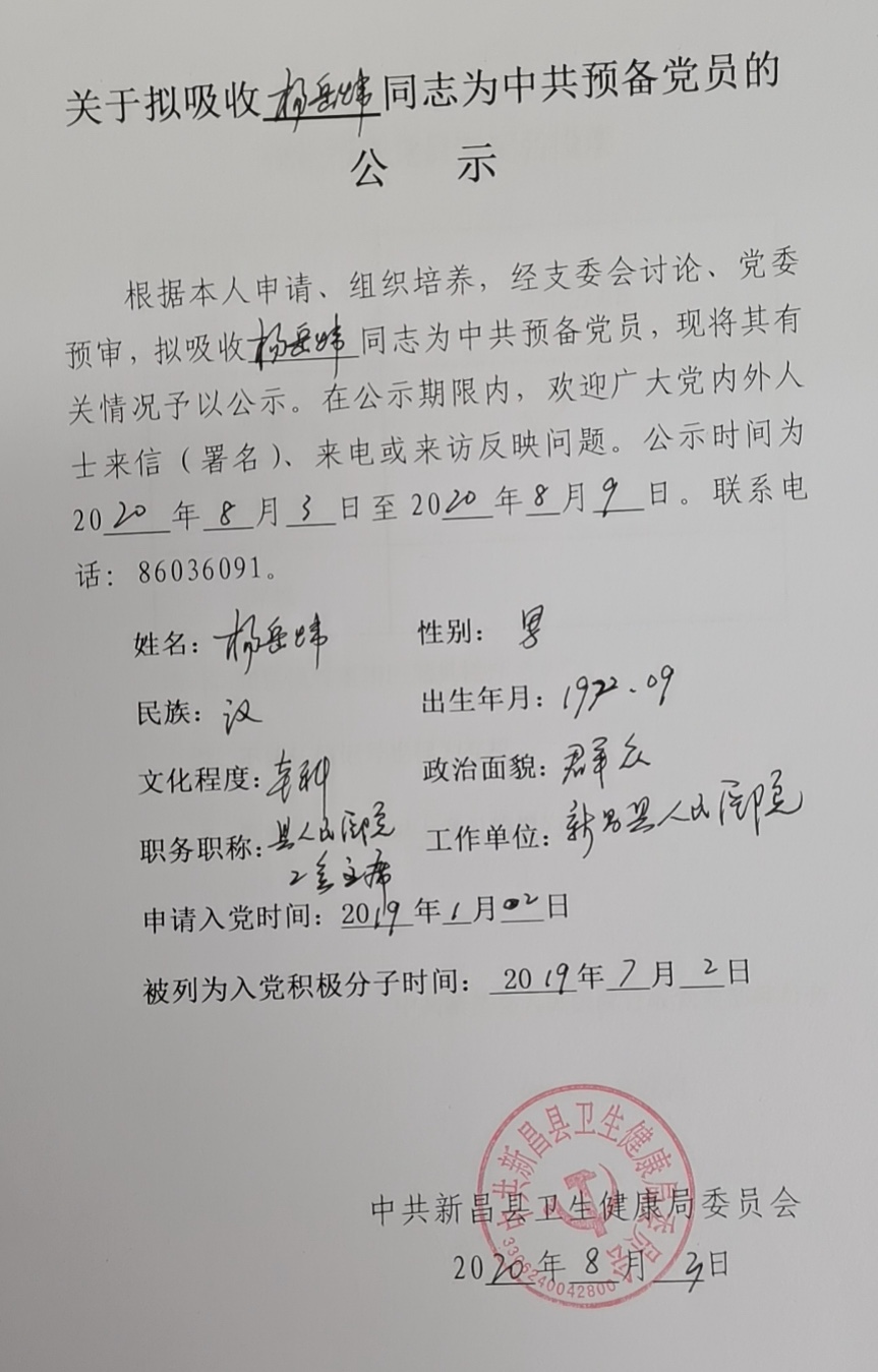 关于拟吸收杨岳炜同志为中共预备党员的公示