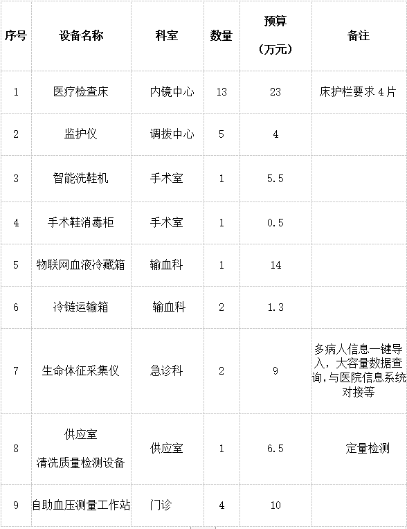 为便于供应商及时了解医院采购信息,根据《财政部关于开展政府采购意向公开工作的通知》等有关规定,按照医院医疗设备采购需求,我院将近期对以下设备进行市场征询,了解相关产品的型号、性能、功能、市场占有率等情况,请符合条件的供应商积极报名参与。
