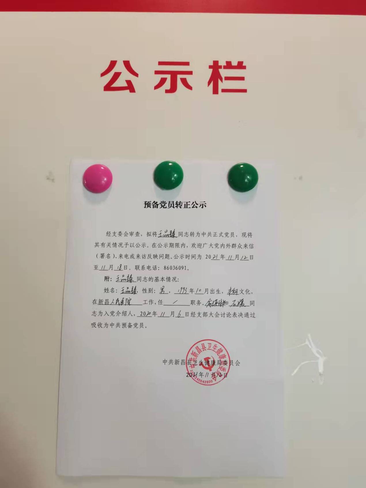 预备党员王品臻同志转正公示