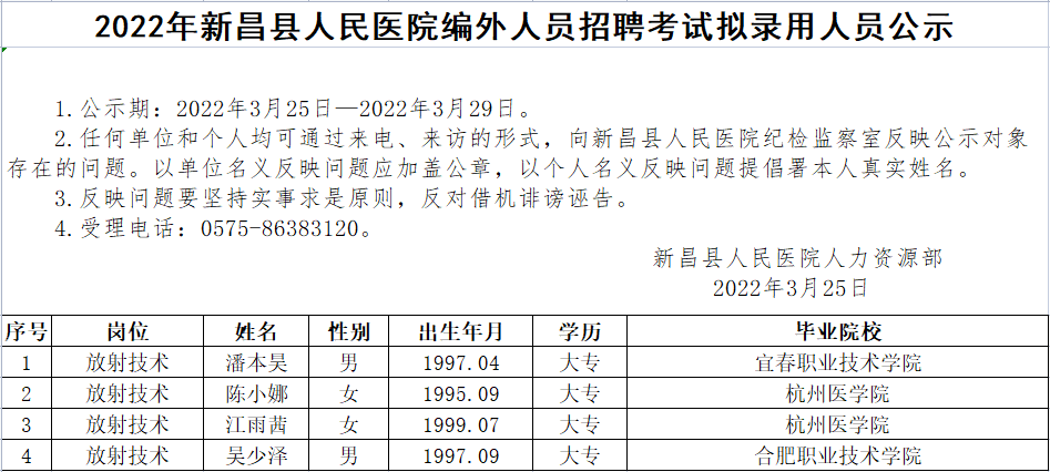 2022年新昌县人民医院编外人员招聘考试拟录用人员公示