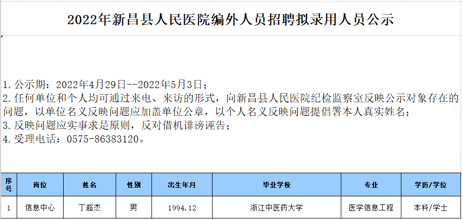 2022年新昌县人民医院编外人员招聘考试拟录用人员公示