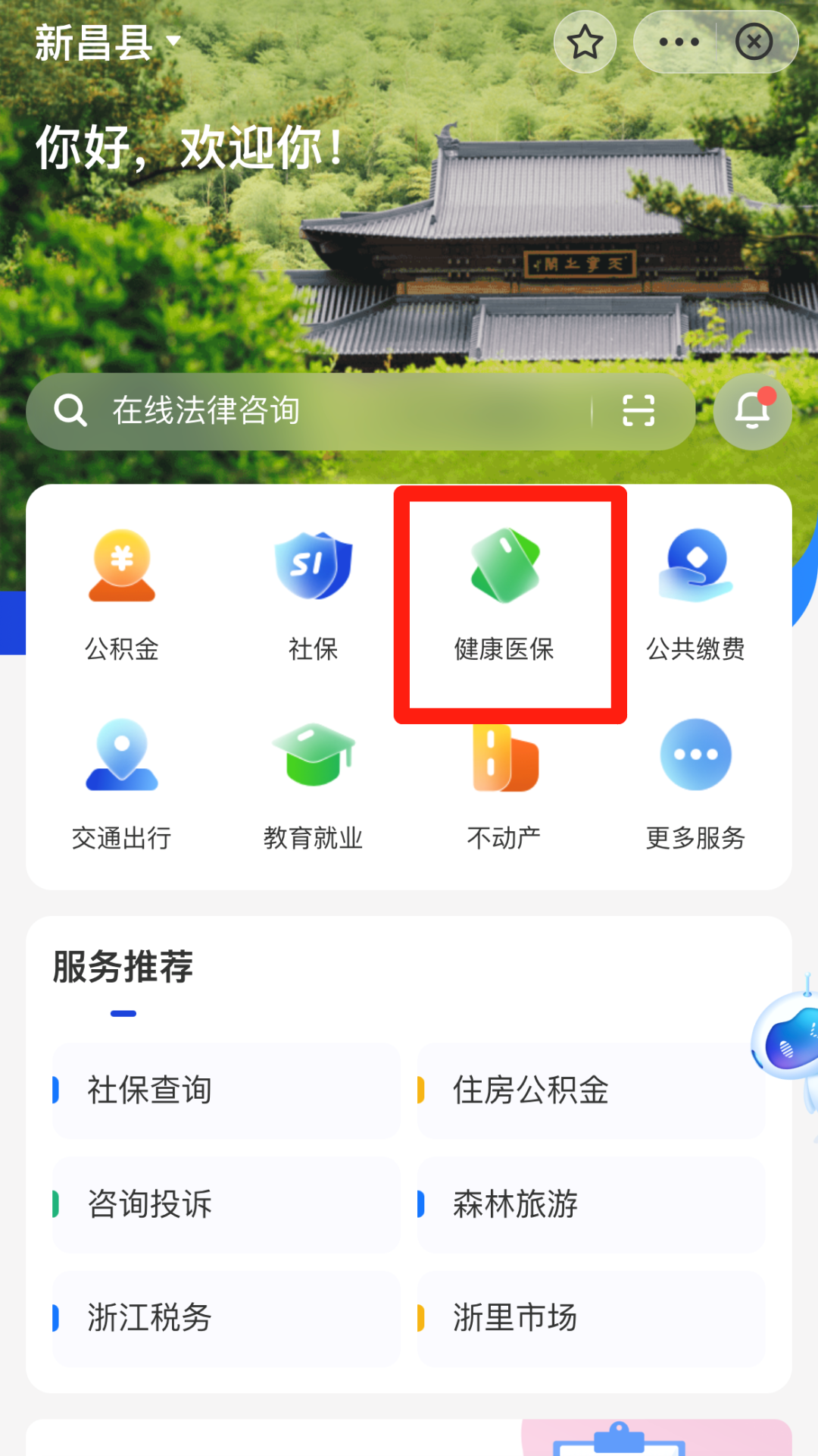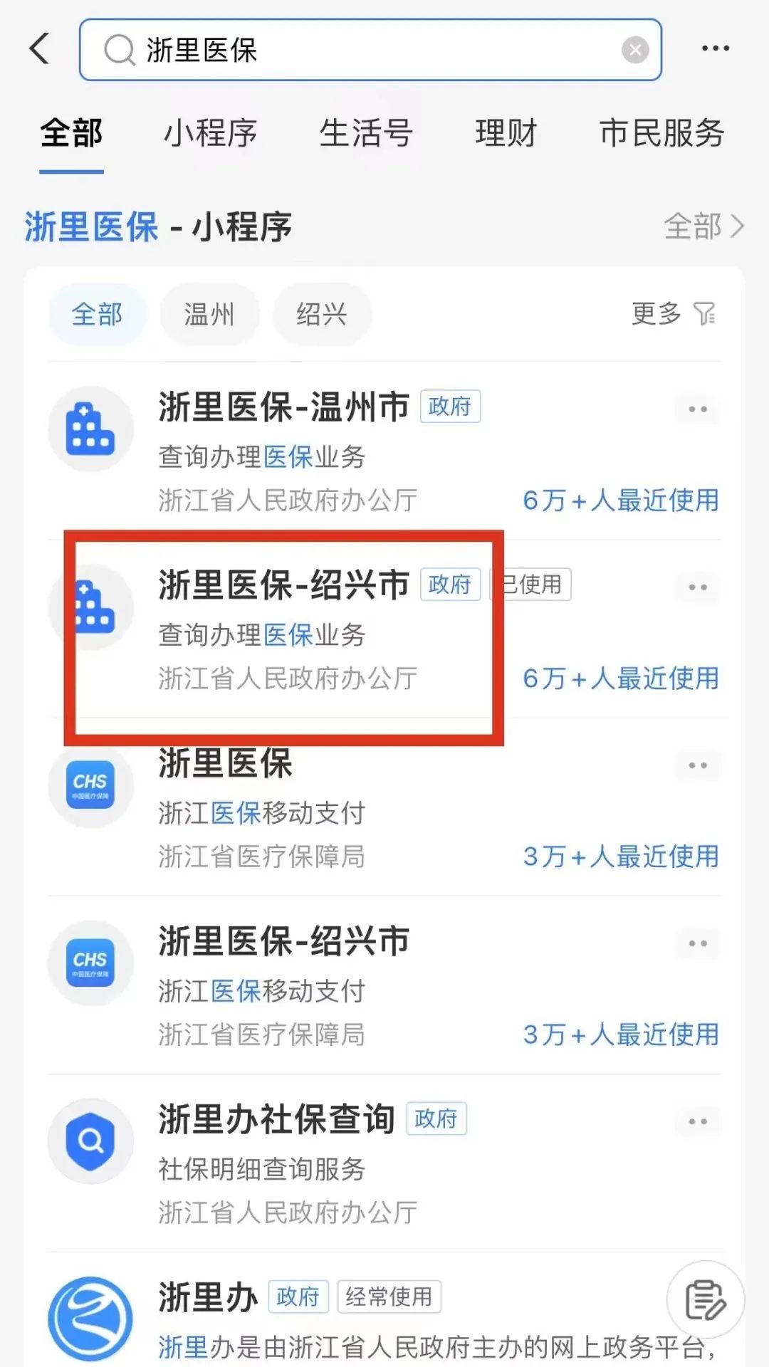 ✔ 打开“支付宝”APP,搜索“浙里医保”,点击“浙里医保-绍兴市”