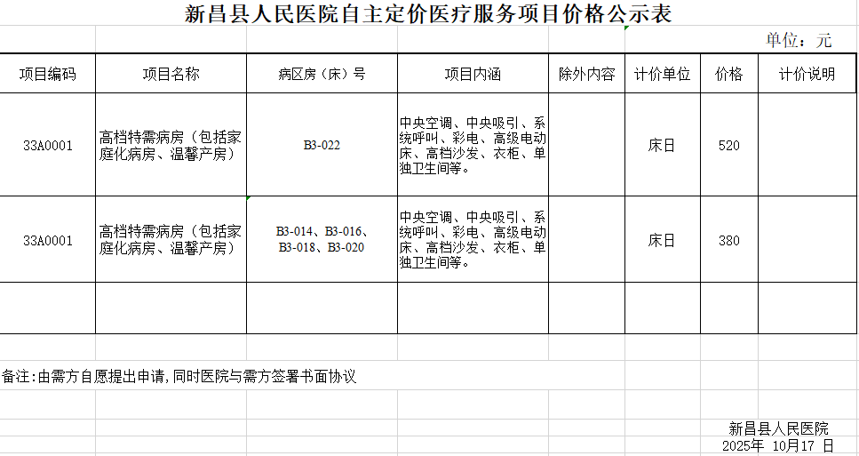 新昌县人民医院自主定价医疗服务项目价格公示表