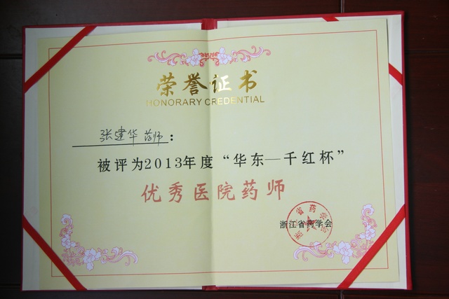 6月28日,浙江省药学会组织开展了第四届“华东——千红杯”优秀医院药师评选表彰活动,我院药剂科张建华荣获优秀医院药师称号。