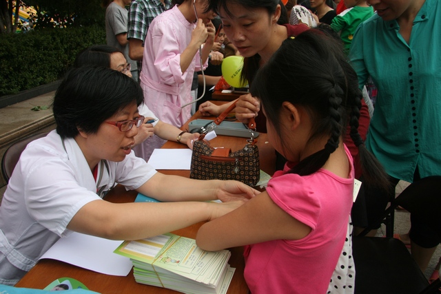 本网讯(孔云云/文/吕黎/摄)6月1日上午,我院儿科众多医护人员在王玲玲科主任的带领下在江滨公园开展免费义诊活动。 当天整个义诊活动现场热闹沸腾,前来就诊的患儿络绎不绝,医护人员仔细地替患儿检查,耐心为就诊患儿家长..