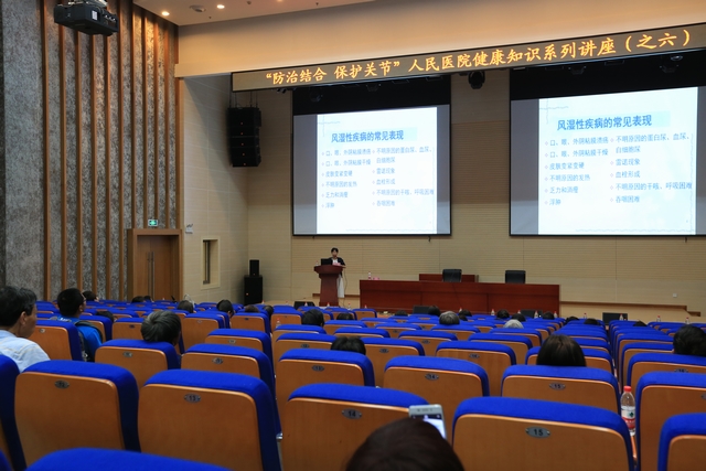 本网讯(吕黎/文/张锴/摄)近日,我院在三馆报告厅举办了题为“防治结合保护关节”的健康知识公益讲座,讲座主要介绍了关节病、风湿、痛风的症状及防治,并在讲座结束后,由主讲医师为市民开展现场咨询。讲座吸引了100余名市民..